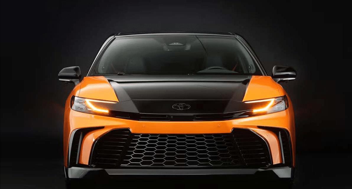 整车采用了极具侵略性的Inferno Flare橙红色涂装,搭配黑色车顶与半黑引擎盖,前脸上方那条连接头灯的黑色饰条更强化了层次感。前保险杠经过重新设计,格栅面积更大,两侧进气口更具赛车气势,看起来比现售的任何凯美瑞都更“杀气腾腾”。