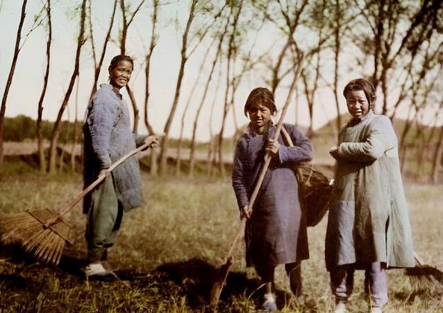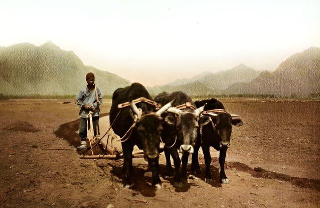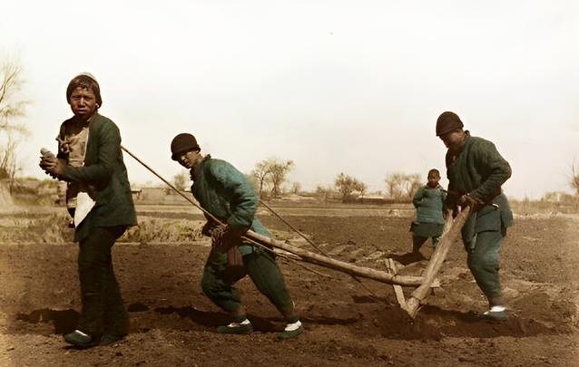 有些人家没牛没马,只能靠人力干活。两个人拽着绳子在前面拉,后面一个扶着犁子,累得满头大汗。效率不高,但这画面却透着股倔强的生命力,让人看了心里有点酸。