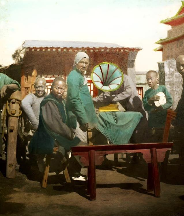 庙会上还有个稀罕玩意儿——留声机!小贩把这新鲜物件往摊上一放,立马吸引了一群人围观。音乐从喇叭里飘出来,路人听得入迷,舍不得走。摄影师拍下这一幕,估计也在想:这东西在1906年的北京,真是稀奇!